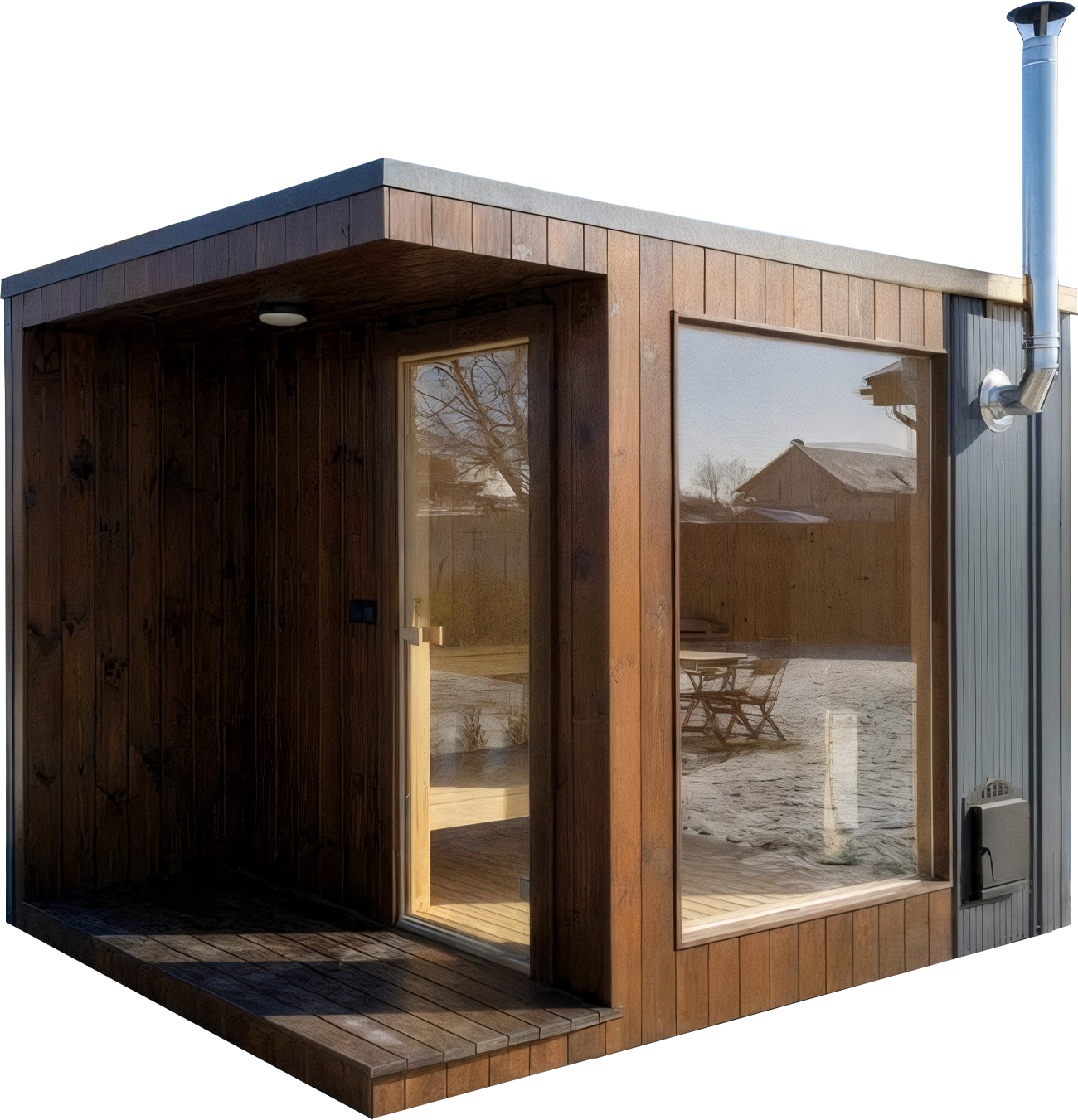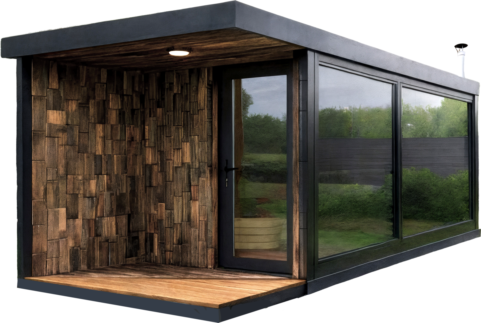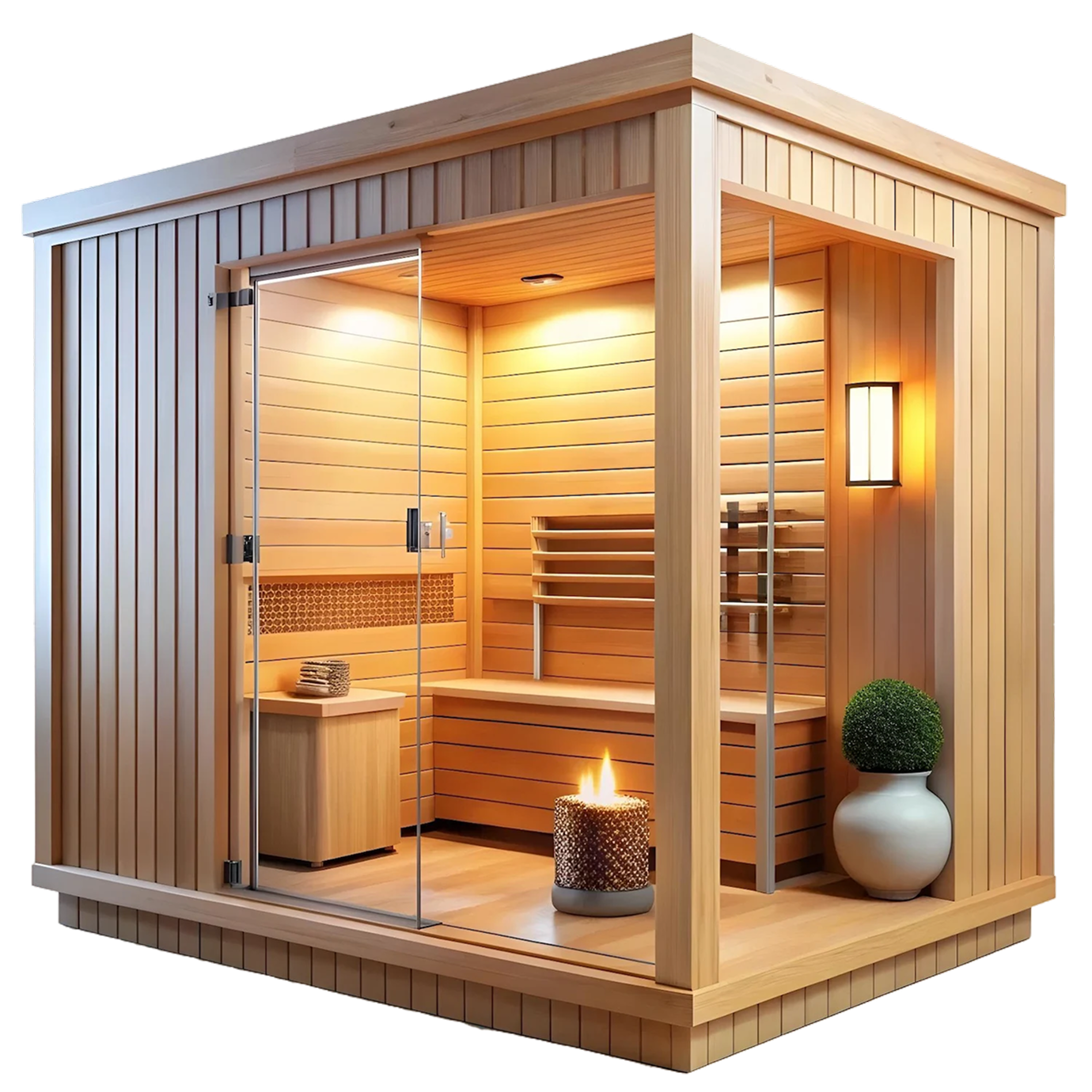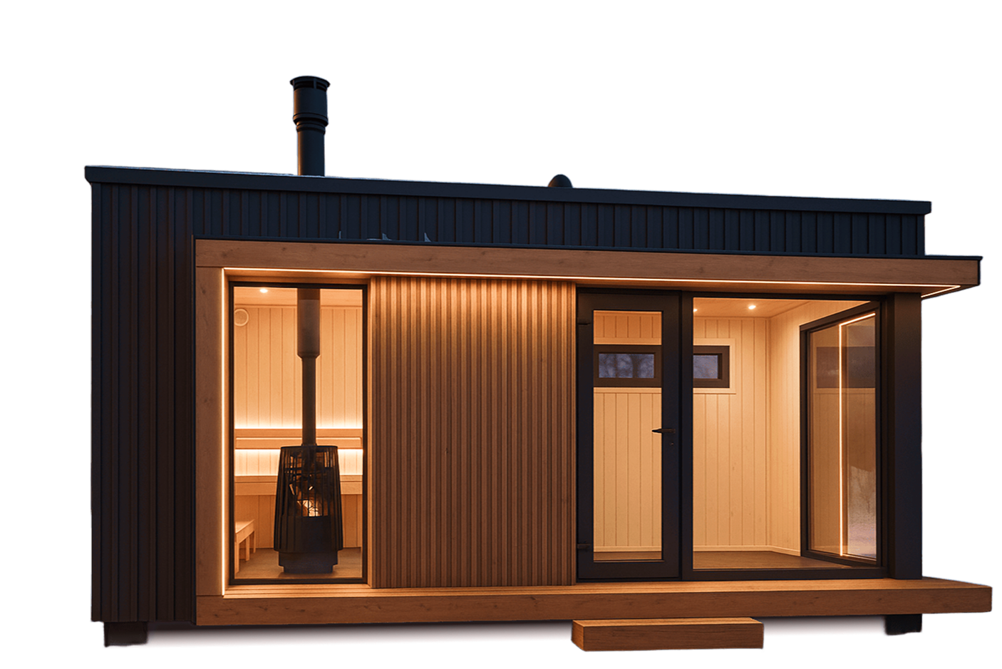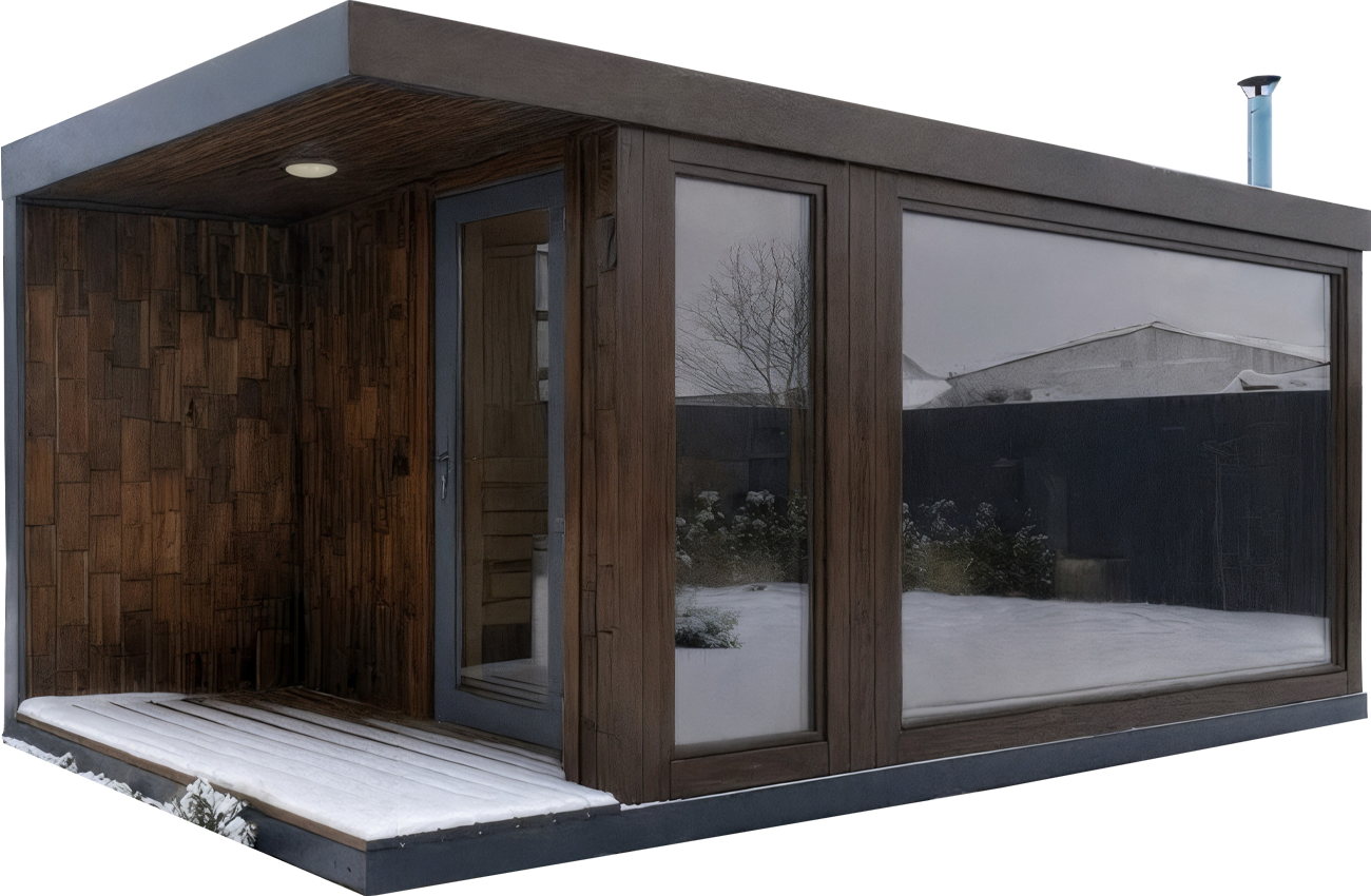 Базовая комплектация SAUNA UA включает полностью готовую конструкцию: утеплённые стены, потолок, пол, внутреннюю отделку, полки, освещение и печь на выбор.