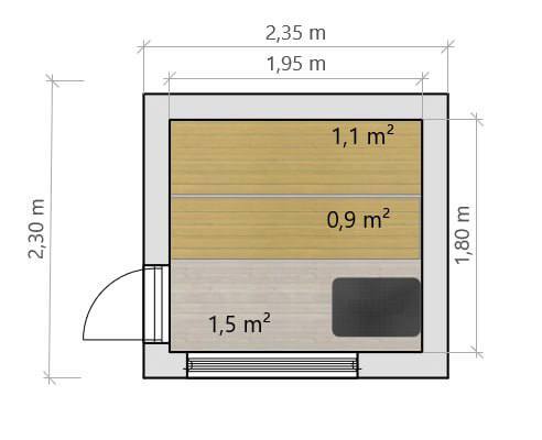 Формат 2,2 × 2,35 метра — это идеальный баланс между компактностью и настоящим комфортом. Здесь удобно двум людям лёжа, когда тело полностью расслабляется под мягким паром. И в то же время — комфортно до четырёх человек сидя, что делает сауну отличным решением для дома или небольшой семьи.