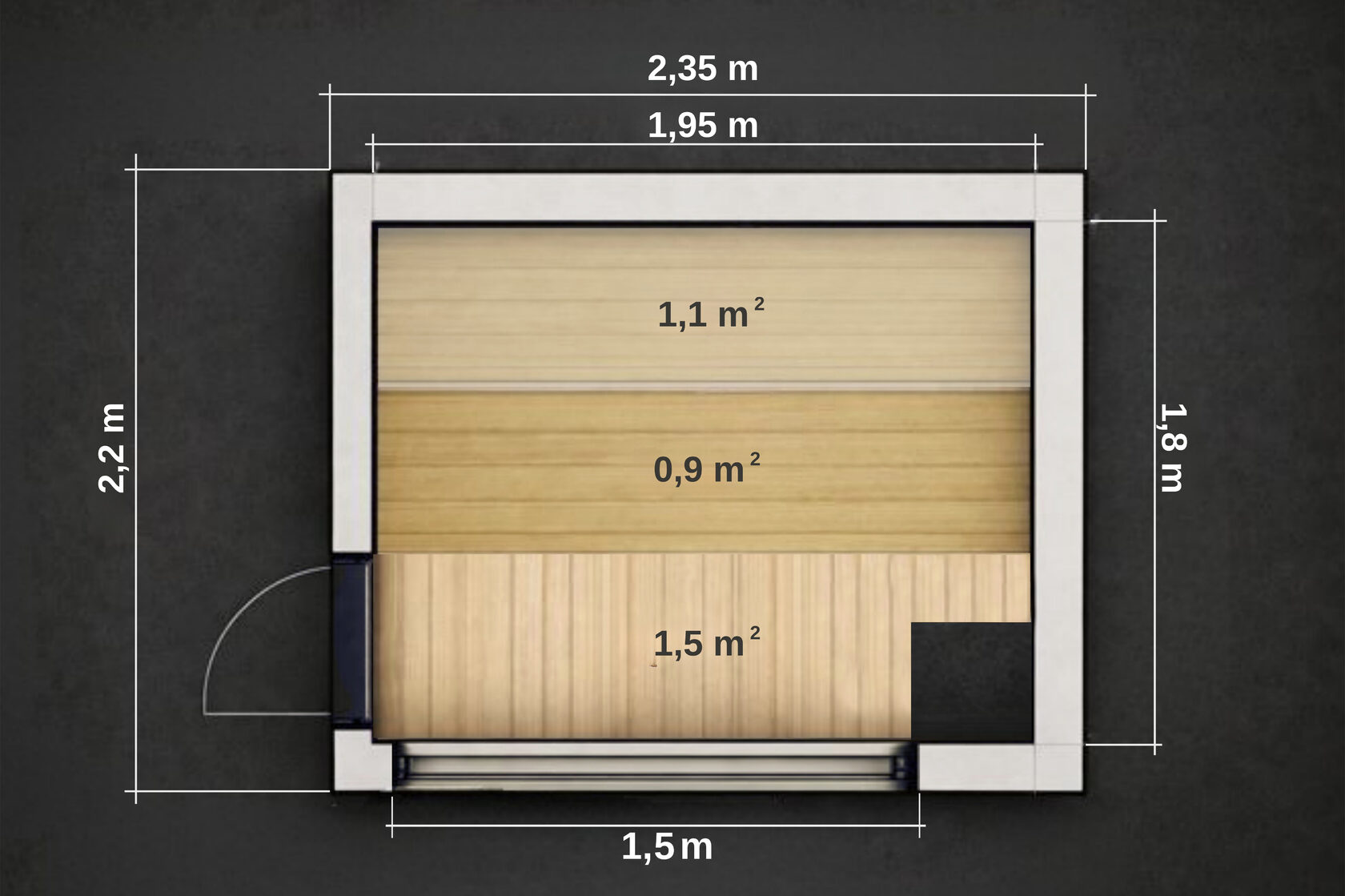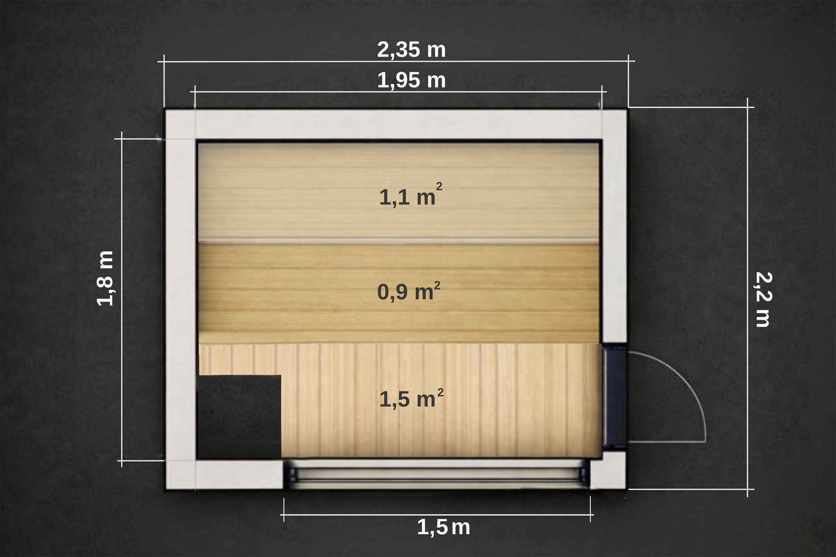 Комфорт для двоих — формат 2,2 × 2,35 метра — это идеальный баланс между компактностью и настоящим комфортом. Здесь удобно двум людям лёжа, когда тело полностью расслабляется под мягким паром. И в то же время — комфортно до четырёх человек сидя, что делает сауну отличным решением для дома или небольшой семьи.