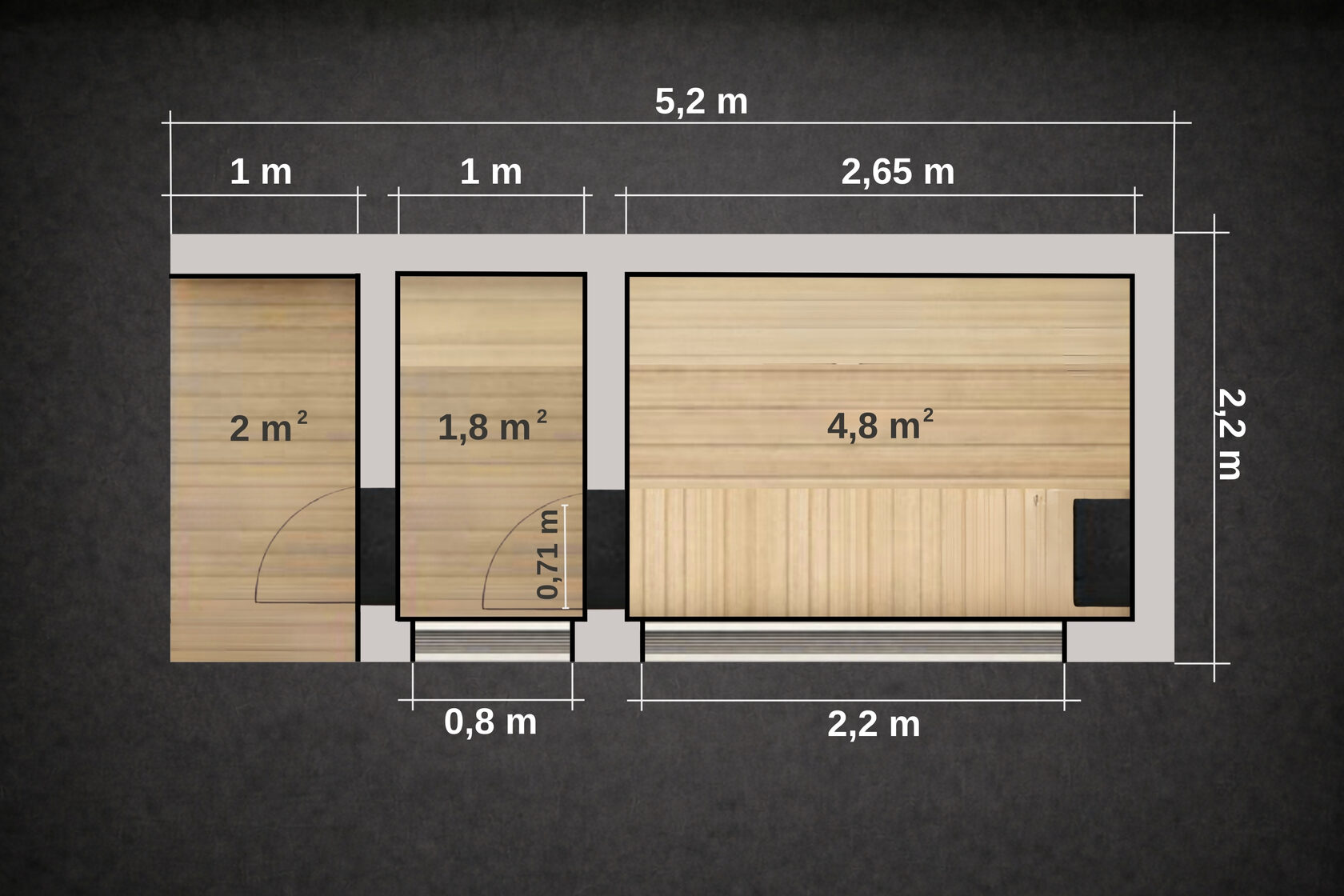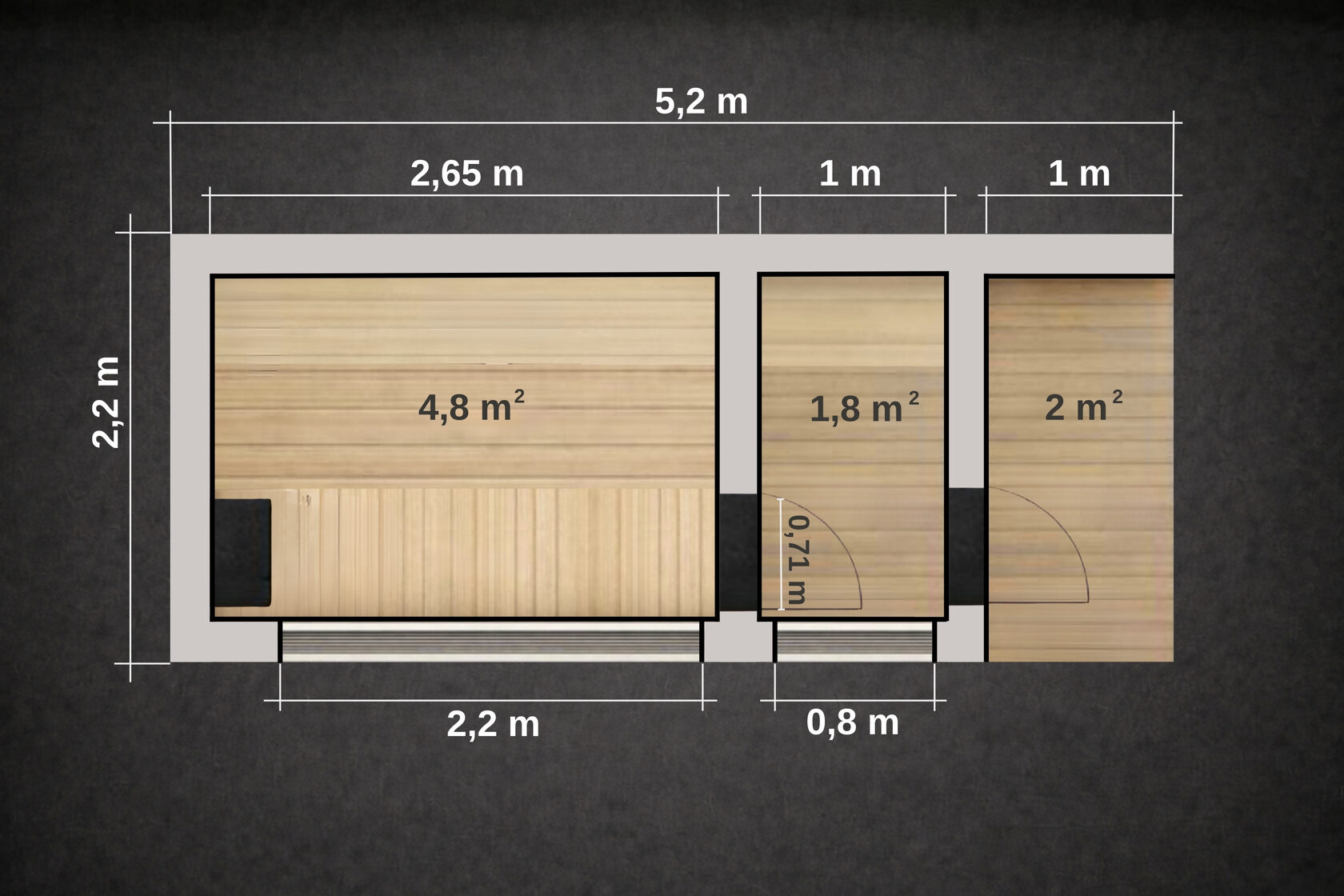 Эта модель создана для тех, кто не принимает компромиссов. Формат 2,2 × 5,2 метра — это уже не просто сауна, а полноценный банный комплекс, рассчитанный на регулярное использование большой семьёй или компанией. Увеличенный предбанник шириной 100 см даёт реальное пространство для переодевания, хранения вещей или душевой. Здесь удобно находиться, а переход в парную происходит мягко, без резкого перепада температуры.