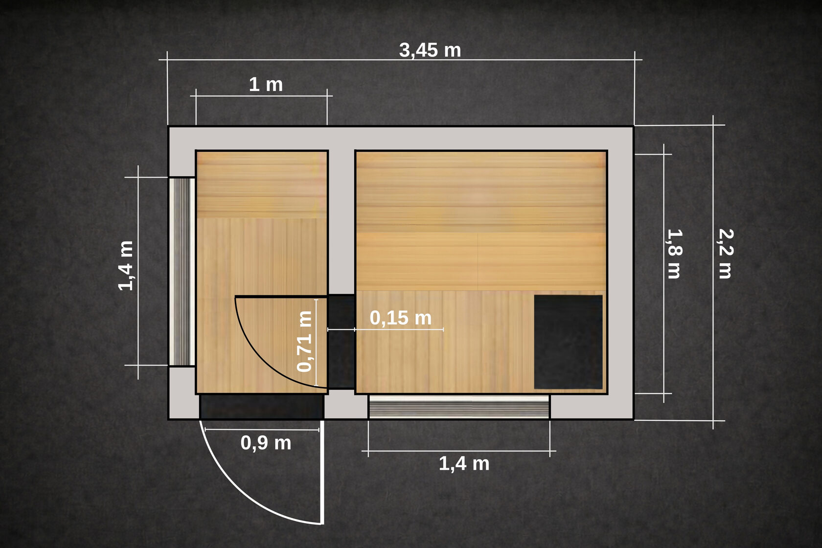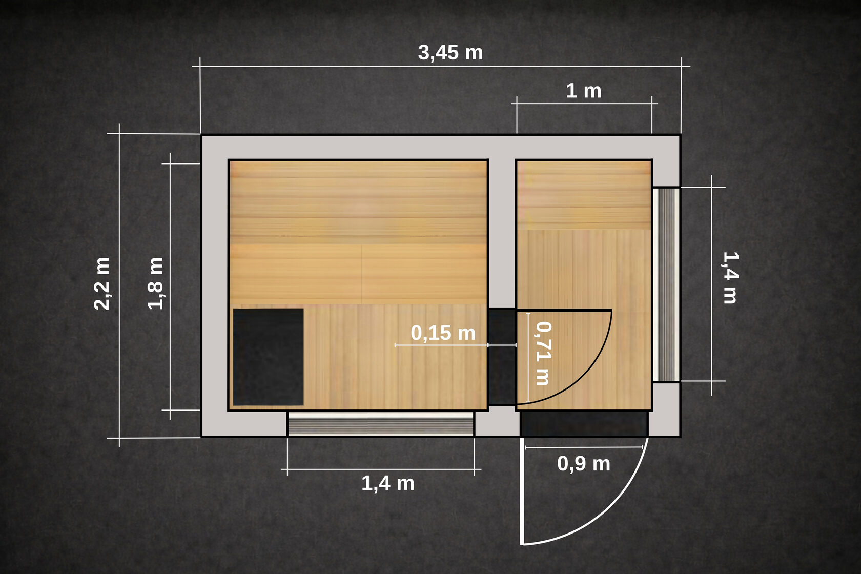 Эта модель создана для тех, кто хочет полноценную сауну с правильной логикой пространства. Формат 2,2 × 3,45 метра имеет отдельный предбанник / раздевалку / душевую, полностью изолированную от парной. Это решение принципиально меняет ощущение пользования сауной: внутри всегда сухо, тепло сохраняется дольше, а процесс отдыха становится спокойным и комфортным. Это уже не просто баня, а полноценный банный модуль.