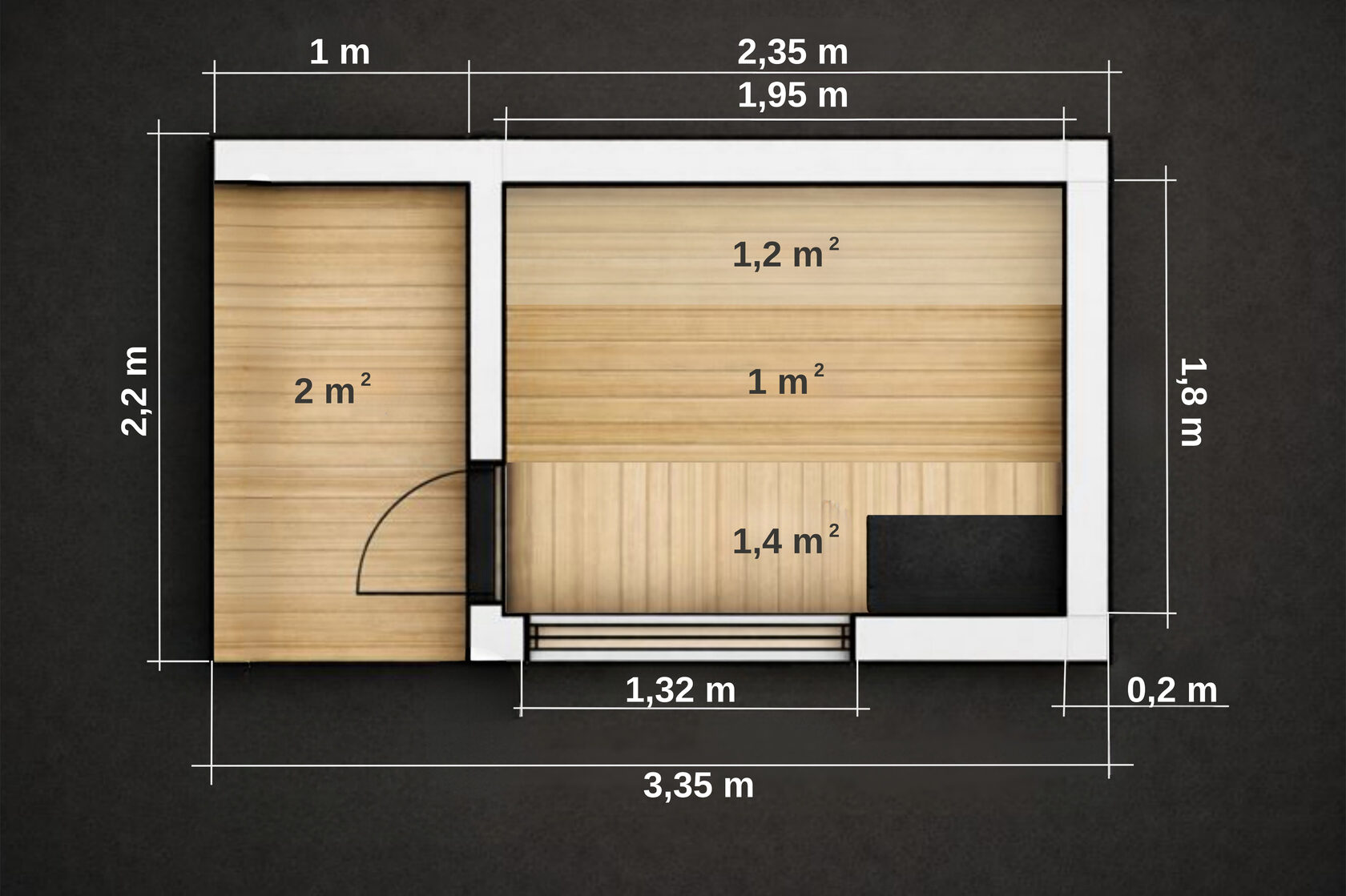 Размер 2,2 × 3,35 метра с террасой делает эту сауну заметно просторнее и функциональнее. Это уже не просто баня — это место, где отдых продолжается и после пара.